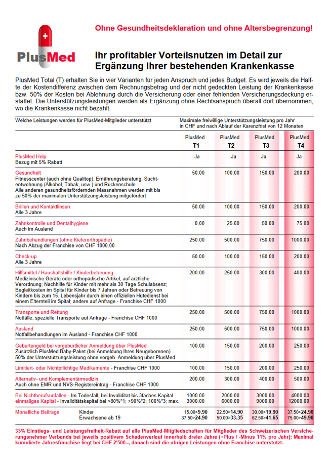 Unterstützungsleistungen PlusMed Total bei Nothilfe, Krankheit, Nichtberufsunfall, Prävention zur Ergänzung der Krankenkasse gemäss zugehöriger Beschreibung und Leistungsblatt.